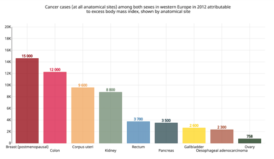 La obesidad y el riesgo de cáncer Según la organización mundial de la salud un 20% de los cánceres son debidos al exceso de peso. En nuestra región europea los cánceres relacionados con la obesidad son el de esófago, tiroides, colon, …